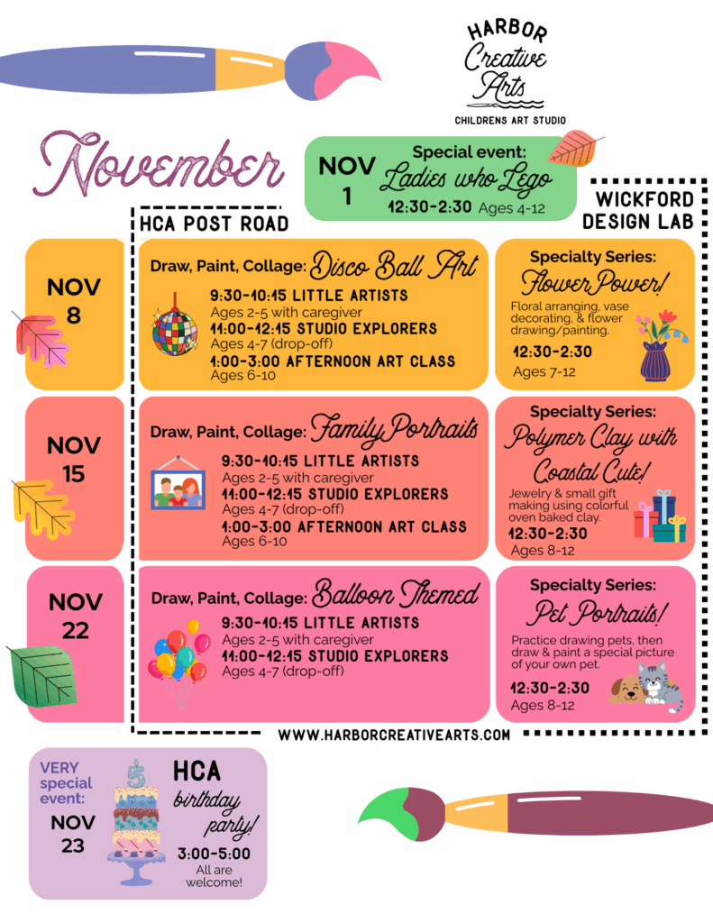 This harborside studio hosts Afterschool Art & Design classes for grades 4-6, STEAM-focused classes & camps including Lego programs, and summer design camps for ages 8-12. And new programs have arrived for ages 2+ starting this fall!