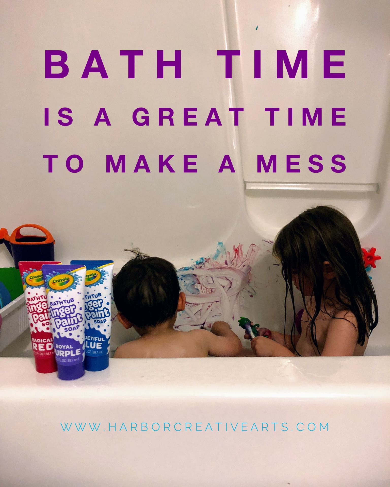 Regardless of your feeling toward tubby time, I’ll let you in on a big secret, the tub (or a stand-up shower) is the perfect place for messy play and art. You just rinse the mess away!
