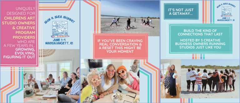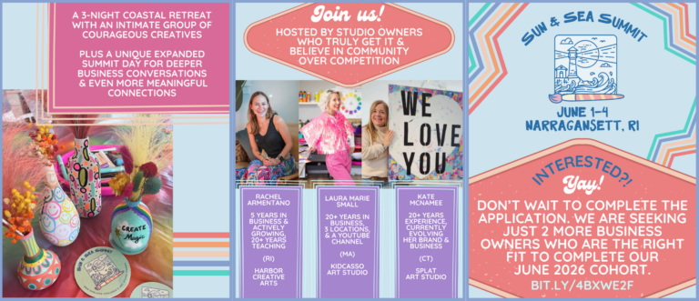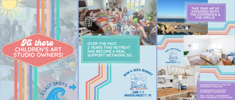 This year, we’re welcoming a new cohort of children’s art studio owners to a stunning coastal beach house in Narragansett, Rhode Island for three days of leadership, creativity, and restoration – a tailored professional development specific to children’s art studios, thoughtfully woven between creative practice, strategic conversation, and restorative coastal time. Retreat attendees experience both the intimacy of their three-night cohort and the expanded energy of this one-day gathering.
